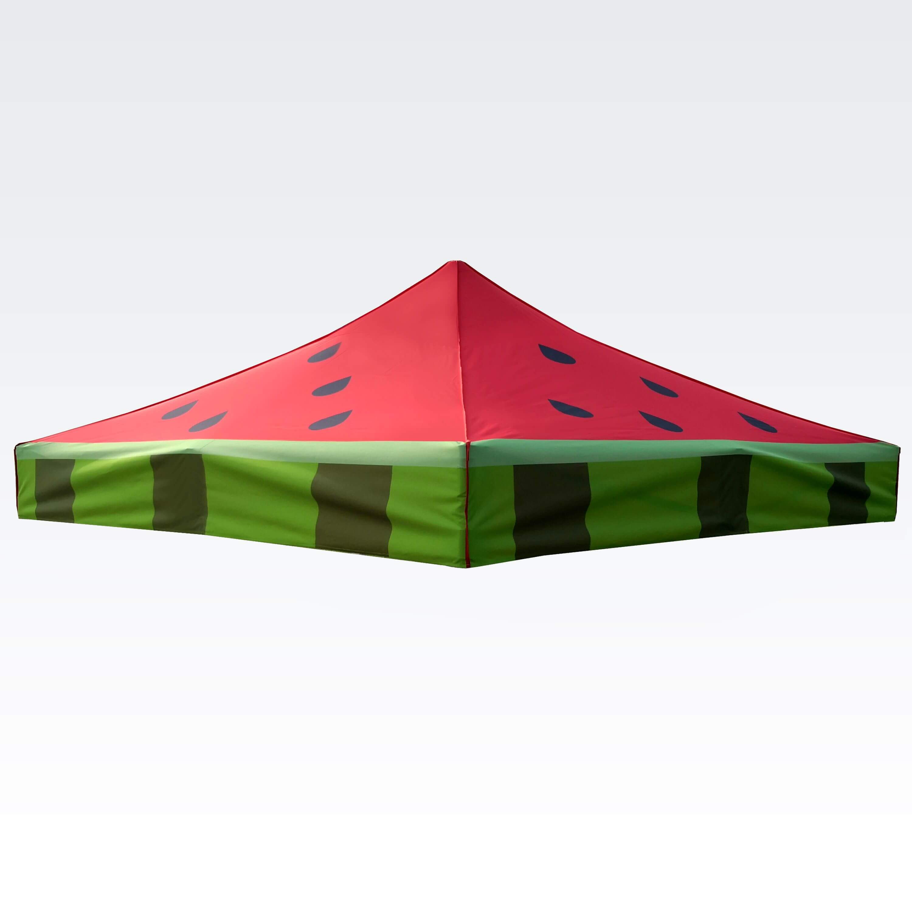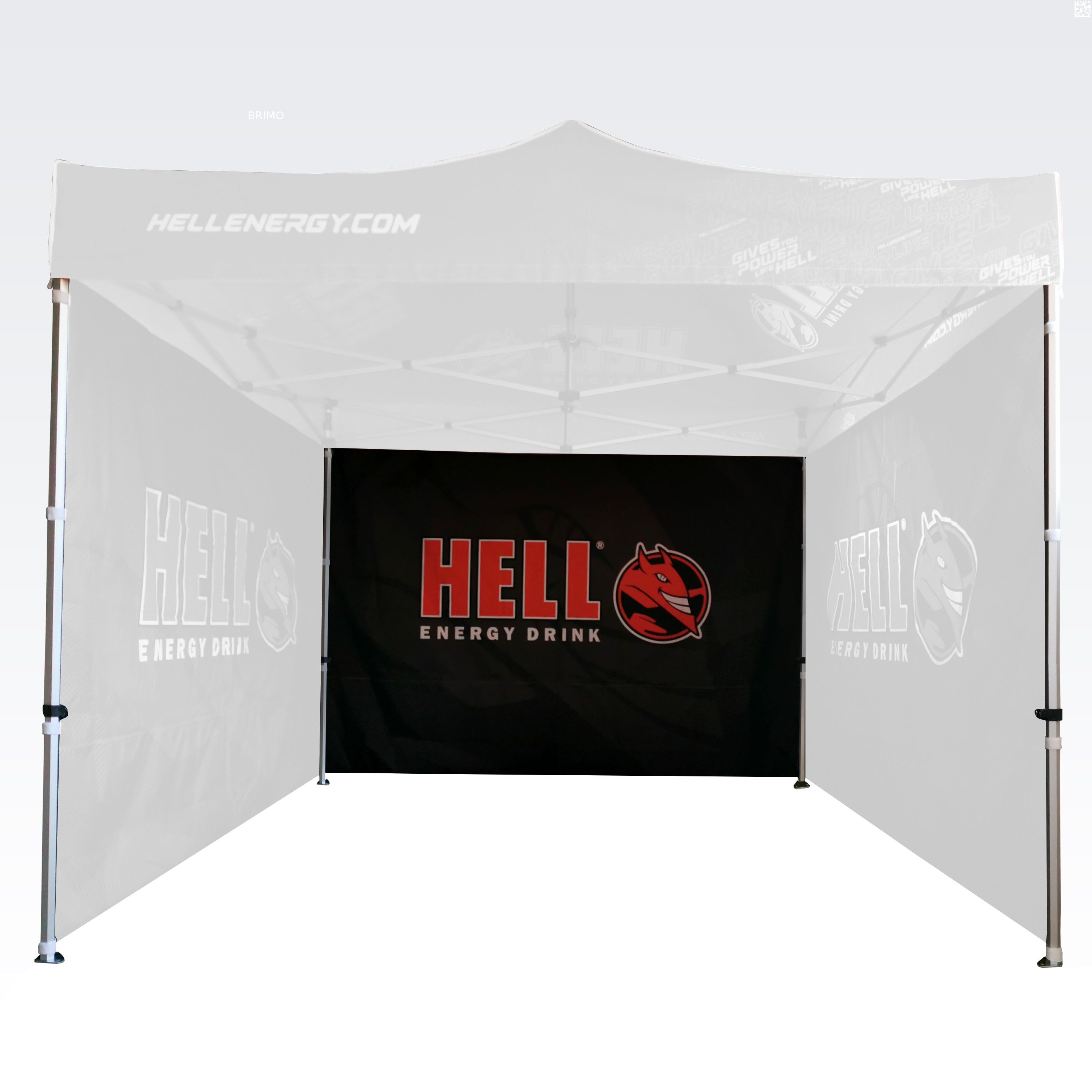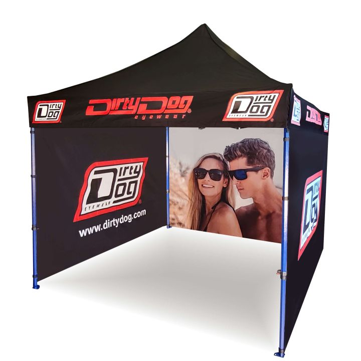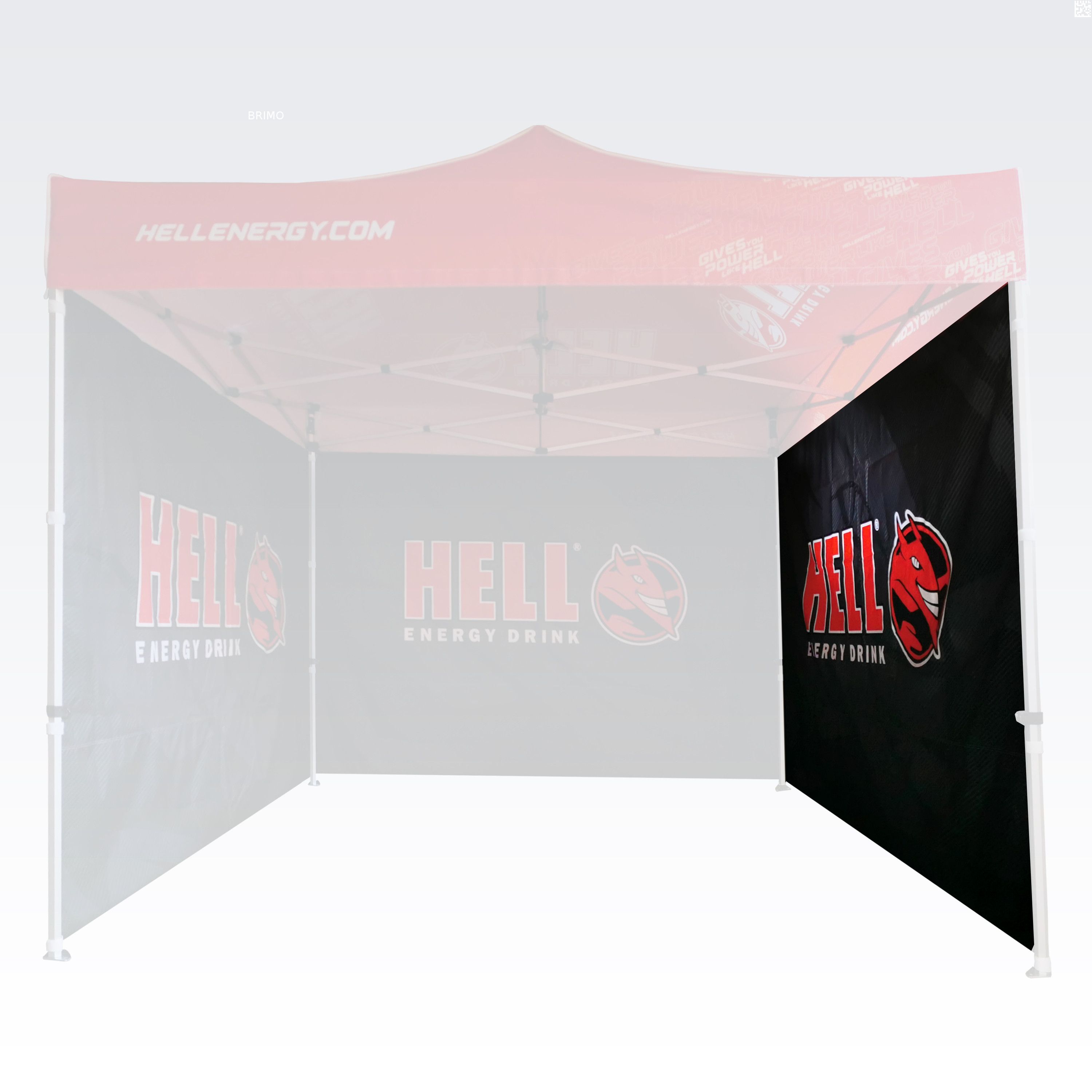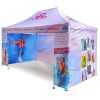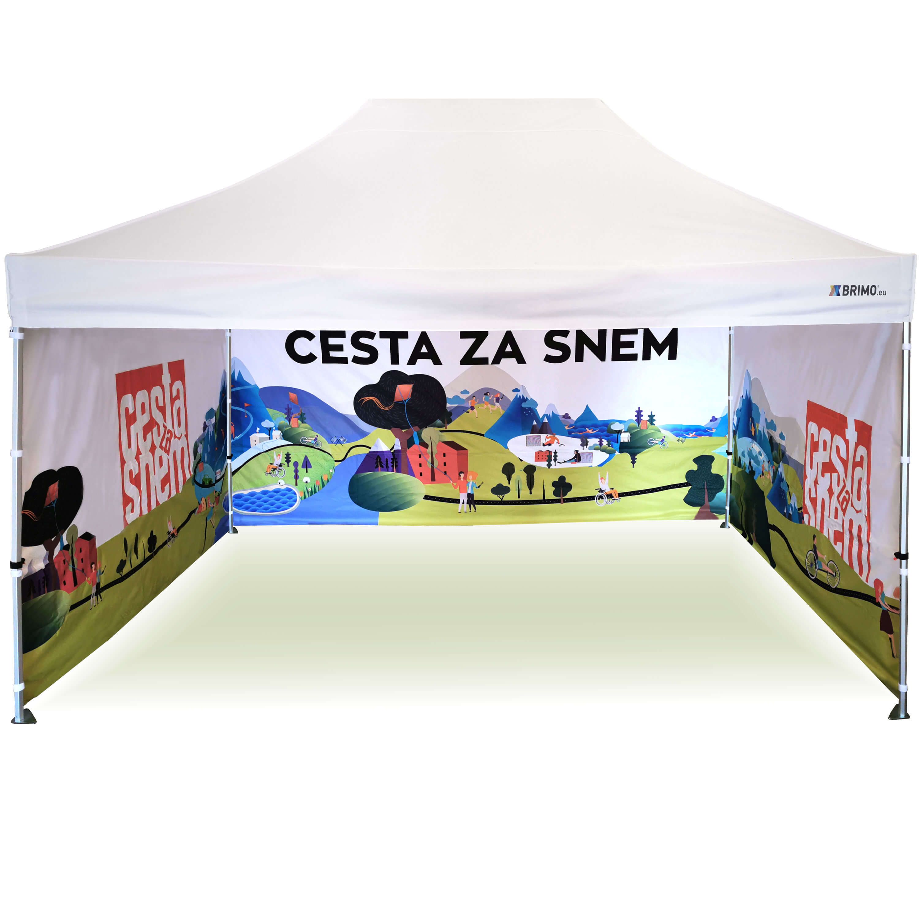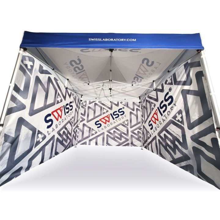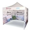Namioty reklamowe z cyfrowym drukiem sublimacyjnym. Proces ten zachodzi w wyniku reakcji chemicznej, w której tusz pod wpływem wysokiej temperatury wnika bezpośrednio w strukturę tkaniny. Logo, tekst lub jakikolwiek rodzaj grafiki na wewnętrznej lub zewnętrznej stronie namiotu według życzenia klienta.